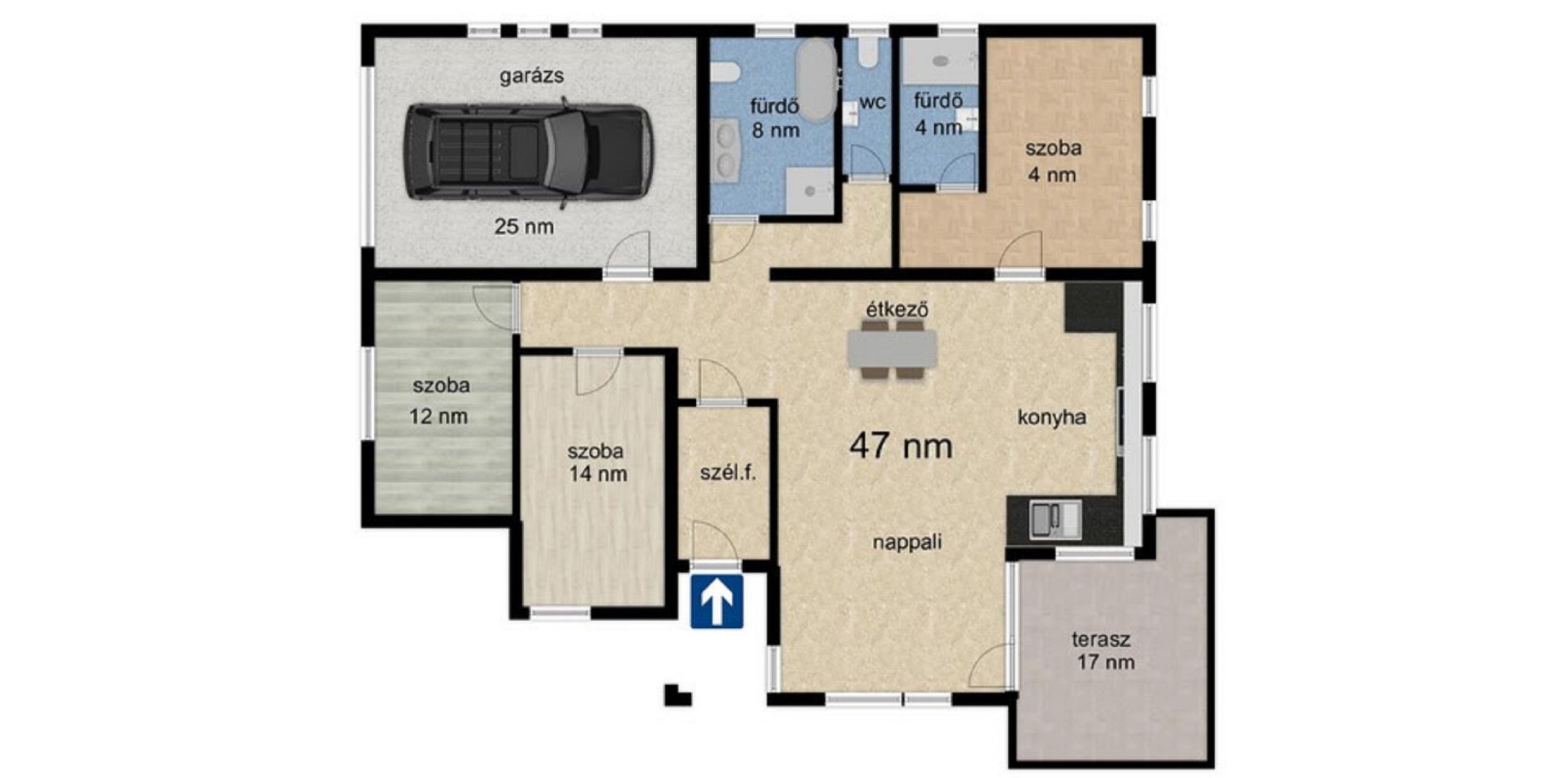 - 144. nm alapterület,17. nm terasz,4. nm fedett bejáró.