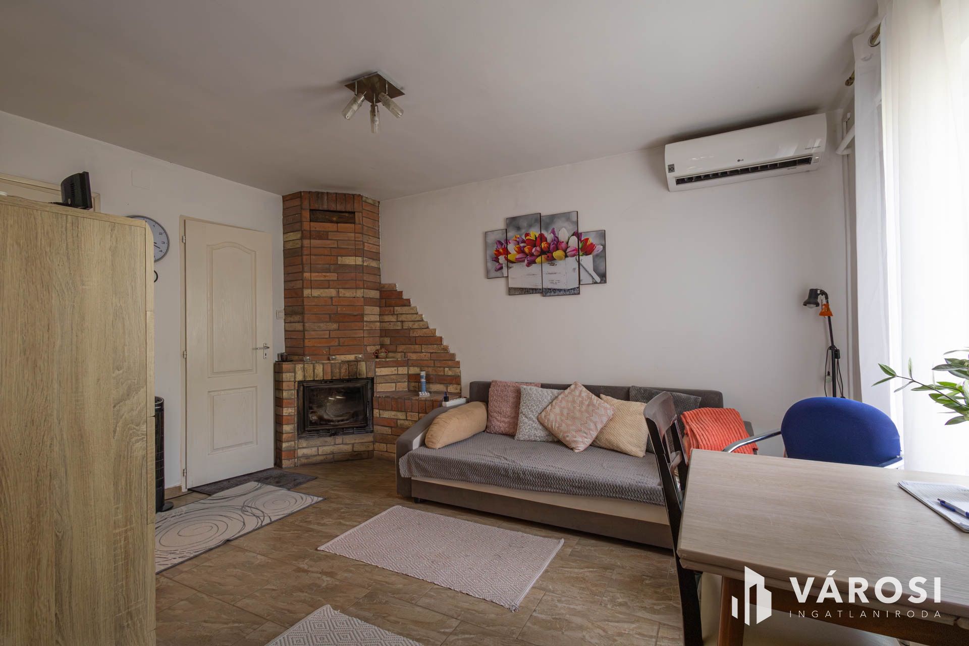 A földszinti részen egy hangulatos nappali, konyha, fürdőszoba és különálló wc kapott helyett. Az új nyílászáróknak, az új villamoshálózatnak köszönhetően komfortos és energiatakarékos lakhatást biztosít. A nappaliban hűtő-fűtő klíma biztosítja a komfortos hőmérsékletet, viszont a hideg téli estéken a kandallóba begyújtva hallgathatjuk a fa ropogását is. Minden ablak szúnyoghálóval ellátott, így a nyári estéken zavartalanul élvezheti a friss levegőt.