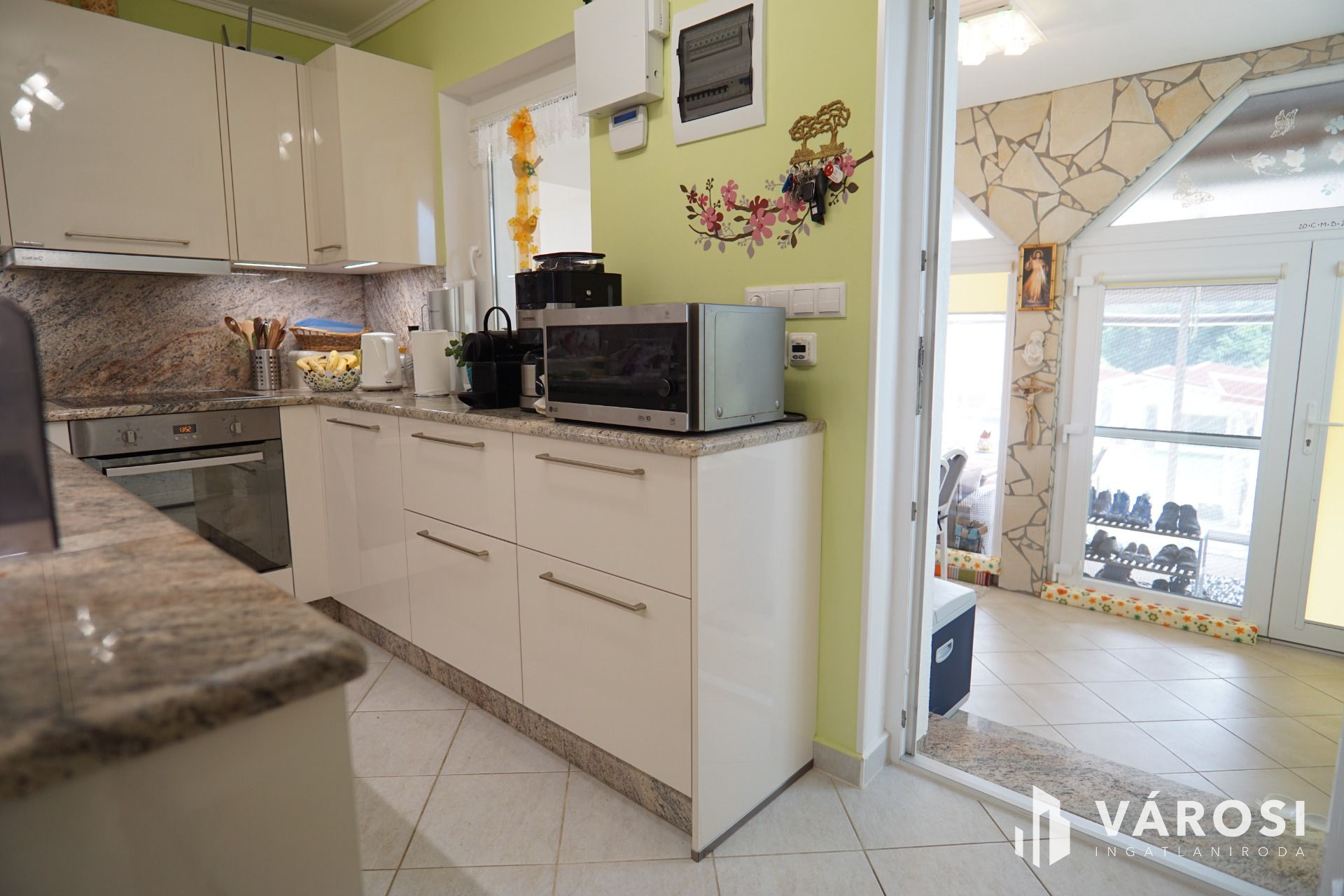 Amerikai konyha nappali étkezős kialakítású, teljesen felszerelt konyhával, (mosogatógép, tűzhely főzőlap....stb) saját vizesblokkal, közvetlen fedett teraszkapcsolttal, udvarkapcsolattal. Ezen épület alatt pincerész is található.