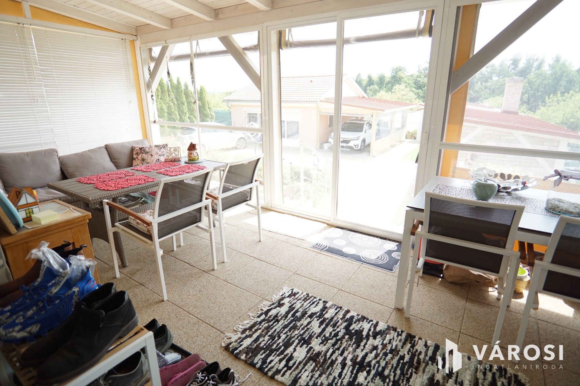 A mediterrán térkővel ellátott udvarról egy lépcsőn keresztül lépünk be egy nagy négyzetméterű teraszra. (ponyvával, szúnyoghálóval felszerelve) Ezen helységből tovább haladva található egy közlekedő és egy étkező , ahonnan közvetlen konyha és teraszkapcsolattal találkozunk. Az épület hátsó szegmensébe található egy dolgozósarok, valamint a fürdő mellékhelységgel együtt. A tetőér beépítésre került ahol található egy nagy hálószoba sok pakolási lehetőséggel.