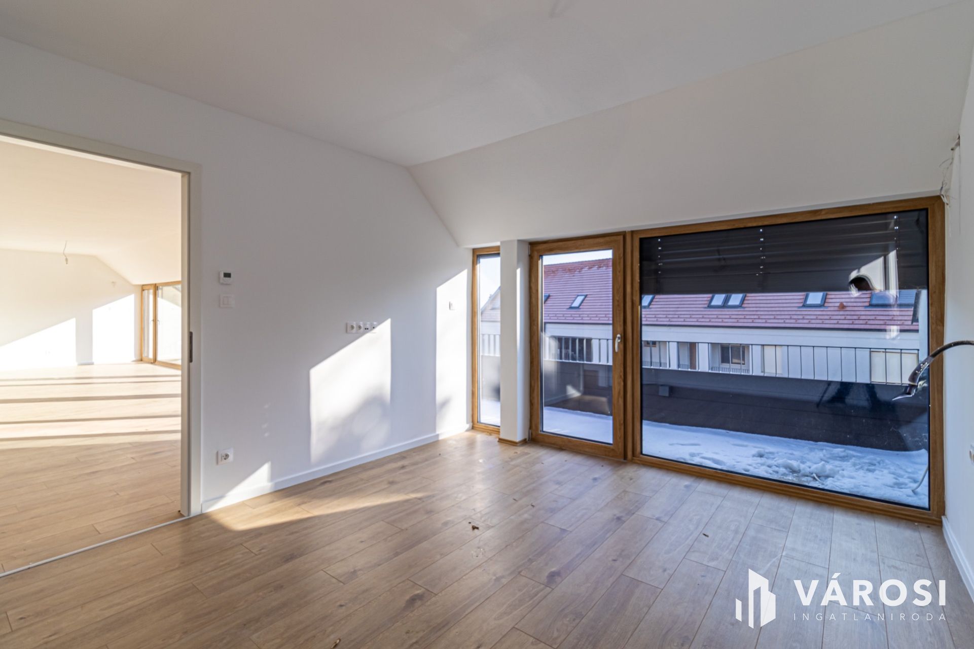 A 105,6 m²-es lakótérhez egy impozáns, közel 23 m²-es terasz kapcsolódik, amely az amerikai konyhás nappali és az egyik hálószoba előtt teljes szélességében végigfut. Délkeleti tájolásának köszönhetően egész nap világos, tágas terei és három külön nyíló hálószobája valódi életteret biztosítanak akár nagyobb család számára is.