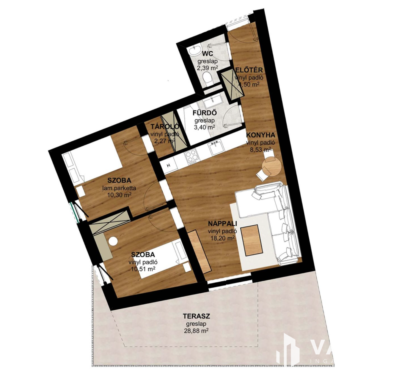 Nappali + 2 hálószobás, nagy teraszos, lakás (60+28,9 m²)