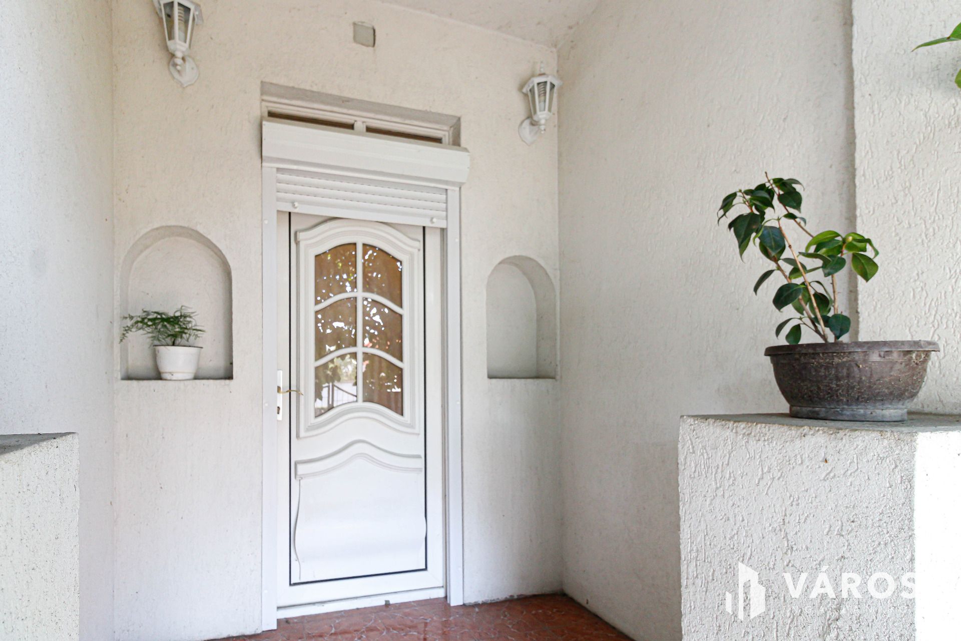 Az udvar rendezett, az előkert dísznövényekkel van telepítve. Fedett garázs és egy tárolóhelyiség található még a területen.
