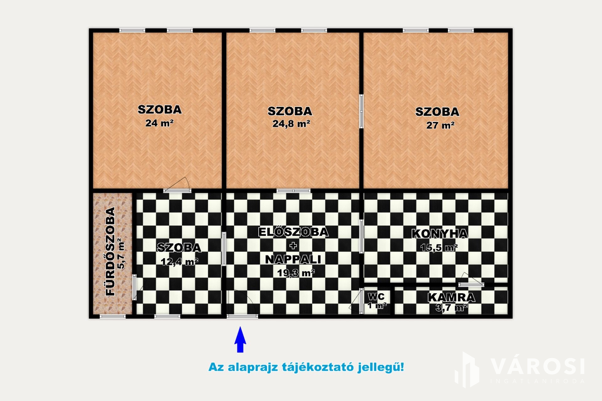 - az szobák klasszikus fa parkettával, az előtér, a konyha, a kamra, a fürdőszoba és a WC járólappal, burkoltak,