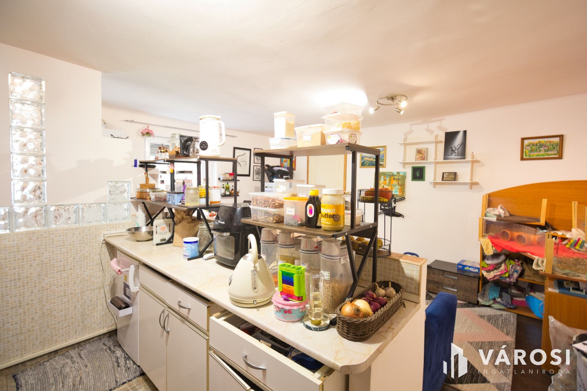 Élelmiszer tárolásra nagy helyiség áll rendelkezésre, ez 8 m2 kamra.
